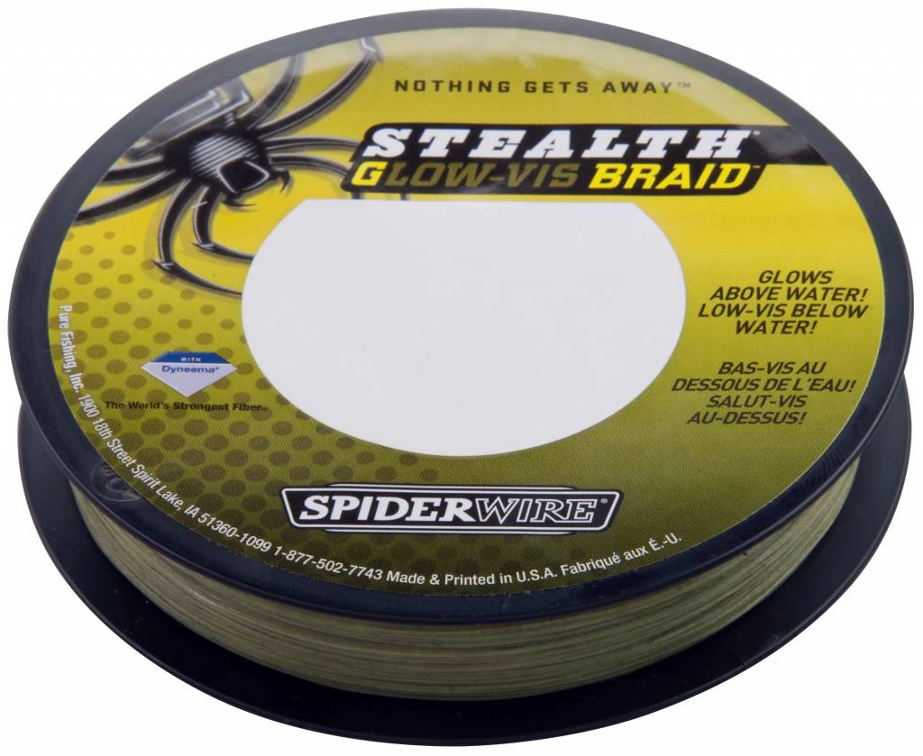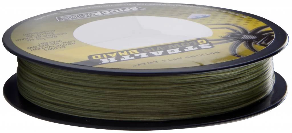 SpiderWire Stealth Glow Vis Dyneema gevlochten lijn is een nieuwe uitvinding binnen de vislijnen. Hengelsporters kiezen vaak voor de Low Vis of groene vislijn omdat deze wegvalt in het water c.q. waterplanten. Maar boven water is de vislijn echter minder goed zichtbaar. Spiderwire Glow Vis gevlochten lijn biedt het beste van beide werelden. De kleur van de lijn is groen, maar deze licht op bij UV straling boven water.